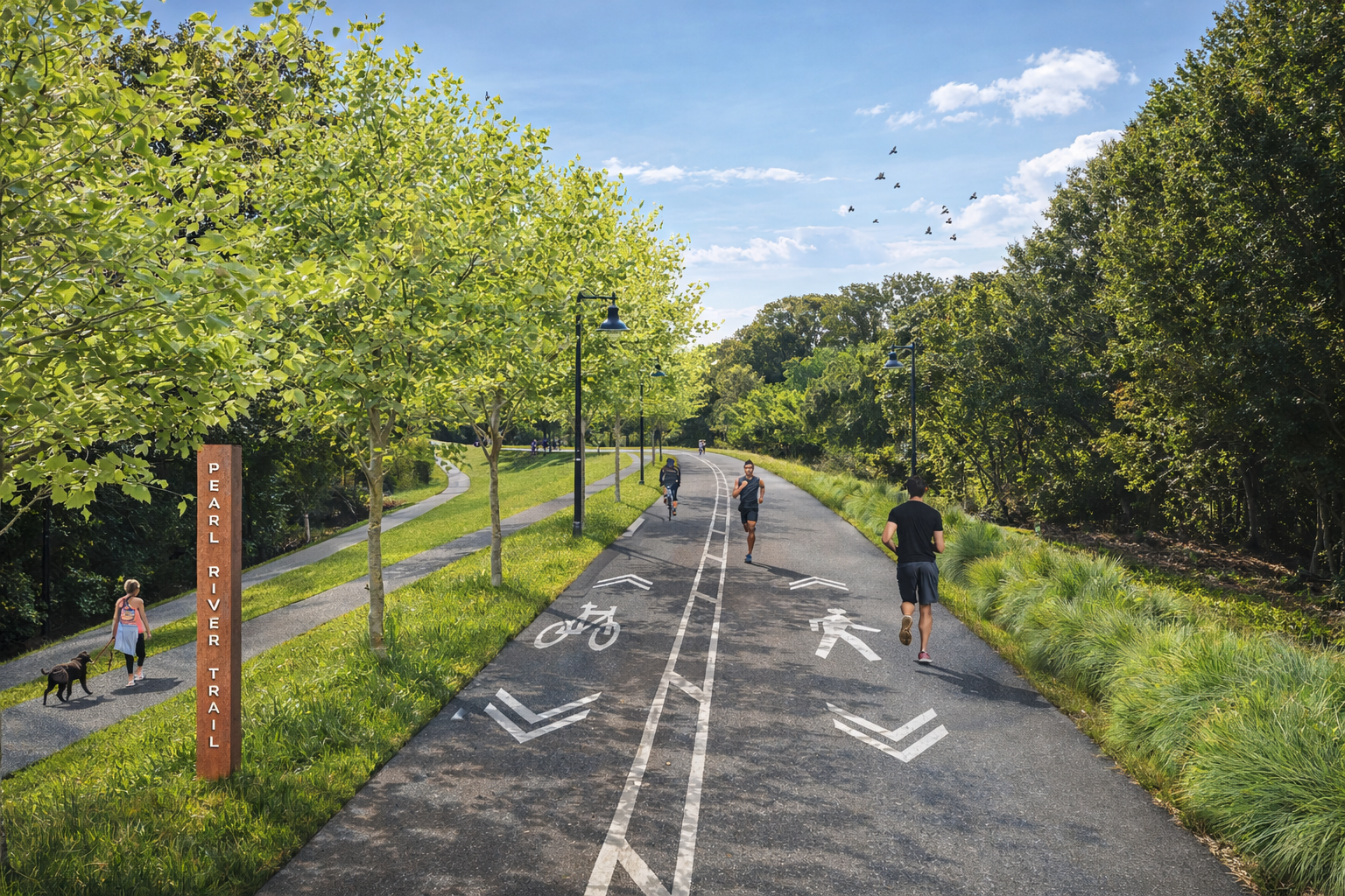 The Pearl River levee, currently serving as a critical barrier against major flood events, presents an opportunity for reimagining urban space that integrates recreation and connectivity. The Pearl River Coalition believes that by transforming traditionally inaccessible areas into vibrant parks and trail systems, the levee can become a welcoming destination for local residents and visitors alike. This design proposal not only enhances public access to the river but also fosters an appreciation for the surrounding ecology through educational programs and interactive spaces. Incorporating natural landscapes with recreational facilities creates a harmonious blend of safety and enjoyment, encouraging community engagement and promoting environmental stewardship along the river.