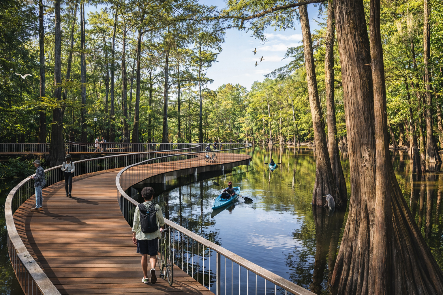 While some areas along the river don't produce viable habitats, certain sections of wetlands are thriving with clusters of bald cypress trees. The proposed Alternative D1 is smaller than previous plans thereby minimizing, to the extent possible, the impacts to these areas. The Pearl River Revitalization Coalition plans to hold design charettes once the project is approved to thoughtfully design green infrastructure that preserves these vital ecosystems by incorporating raised walkways that minimize disturbance to local wildlife. Elevated paths create natural overlooks that meander through the wetlands, allowing visitors to enjoy the serene beauty of the area while protecting the delicate balance of its inhabitants. This approach ensures both the ecological integrity of the wetlands and the experience of visitors are prioritized.
